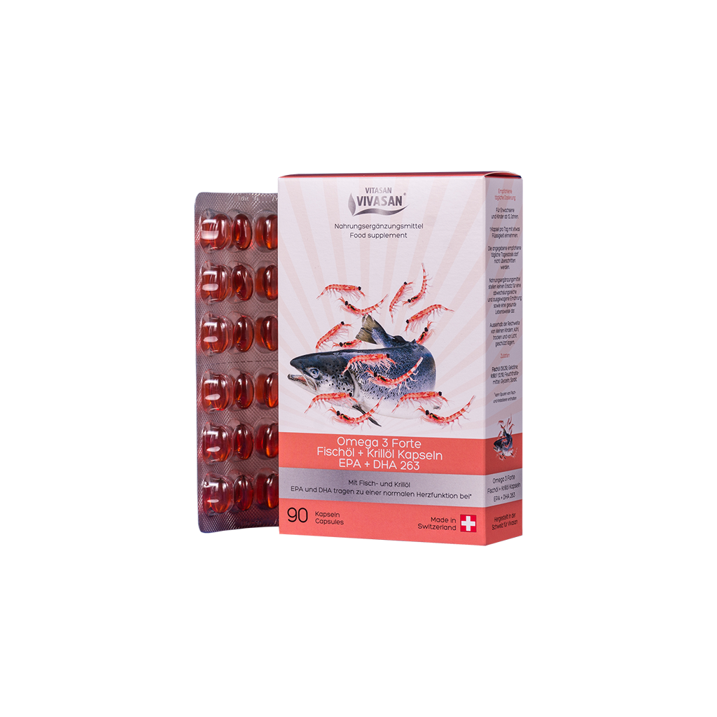 Капсули Вівасан Омега 3 форте Рибний жир + Олія криля — високоефективна біологічна добавка до їжі (БАД). Комбінація риб'ячого жиру з олією криля підвищує вміст омега-3 жирних кислот у капсулі. У результаті одна капсула забезпечує добову потребу організму (263 мг) в Омега-3 жирних кислотах (EPA ейкозапентаєнова кислота + DHA докозагексаєнова кислота).